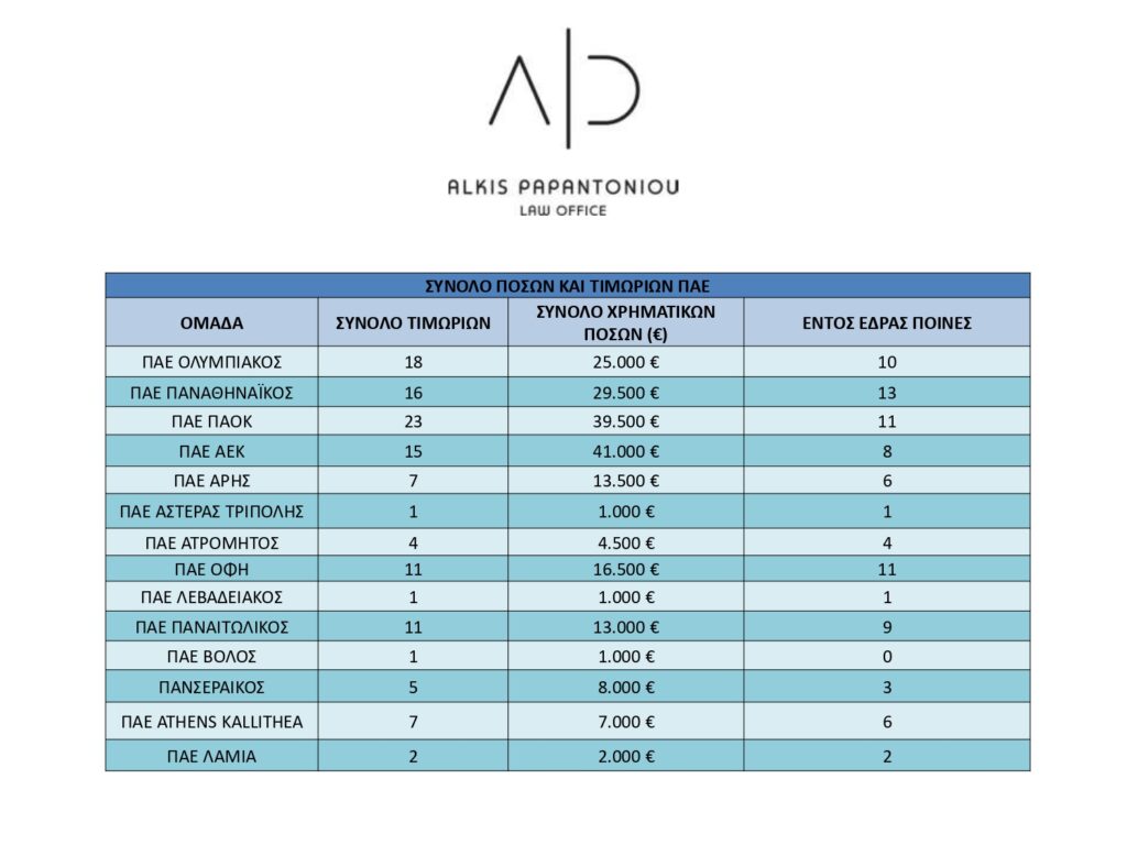 Με την ολοκλήρωση και την έκδοση των πειθαρχικών αποφάσεων του Πρωταθλήματος Stoiximan Super League 2024-2025, παραθέτουμε στο συνημμένο πίνακα, την “Βαθμολογία / Ποινολόγιο” των 14 ομάδων της Superleague 1, όπως αυτό προκύπτει από τις δημοσιευμένες αποφάσεις του Μονομελούς Πρωτοβάθμιου Πειθαρχικού Οργάνου της Superleague στην επίσημη ιστοσελίδα της SL1.